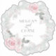 A wreath of pastel light Pink Roses with Silvery leaves and eucalyptus with sparkles all surround the bride and groom's names and wedding date - A combination of script calligraphy combined with a minimalist, contemporary style text layout makes it a trending style wedding suite. This is part of a wedding stationery collection with matching wedding accessories. Design created for the BarefootBride™ © by WhimsicalArtwork™