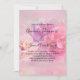 A wedding invitation with a photograph featuring a bouquet of pink and white carnations. Set on a dreamy ethereal background.