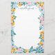 Lovely floral personalised stationery with your name in a thin blue script with swashes and a frame of flowers in pink, yellow, and blue.