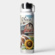 Pretty personalised water bottle with a brown, black and white spotted horse surrounded by sunflowers and a rustic red barn in the background.