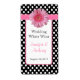 Stylish black and white polka dot mini wedding wine labels ready for you to personalise with your own information. A pink edged white text area, in the middle has pink and black custom text and graphics of a pink ribbon, with a pink Gerber daisy decorating the top. Great for your wedding reception or your home made wines.