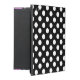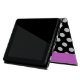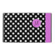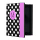 Stylish iPad folio style case with built in stand done in a black and white polka dot. A bright pink band, running down the right front edge and a bright pink disc, on the middle front, has a black one letter monogram ready to personalise. Makes a great personalised gift idea.