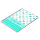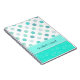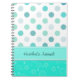 Stylish notebook, with mint green, aquamarine and white polka dot and circular patterns. A aquamarine and white band, across the bottom, has custom teal coloured script text. Personalise the text to read what you want. Great for home, school, or office.