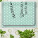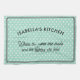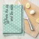 A stylish kitchen towel in light aqua, patterned with white polka dots. The caption is "(Name)'s Kitchen. Where the cakes are made and the stories are told". The pretty tea towel can be personalised with a name, and makes an ideal gift for lovers of cooking and baking.
