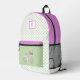 Pretty pink and green backpack, with light green on white polka dots and solid pink accents accents. Graphics of a pretty pink and white bicycle, decorates the pocket area. Personalise the one letter monogram to suit your needs. Great for school, work, travel and more.
