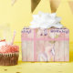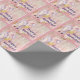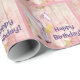 This Happy Birthday! wrapping paper for girls features a pretty pink and purple horse with a background of pink and yellow daisies on a faux wooden background.