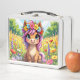 A cute personalised Lunch Box you can add your child' name to. An adorable pony with a ring of purple and pink flowers on her head. A sweet whimsical ai illustration that is bright an colourful in pink, blue, yellow and purple.