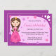 Cute and fun pink princess birthday party invitation for girls featuring a little princess cartoon girl with a crown and pink dress with flowers on a purple background and surrounded by pink and purple stars. Girly design for kids, great for princess themed birthday parties. For custom requests or help with customising please use the store contact link.