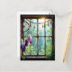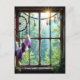 A beautiful postcard to say hi and keep in touch with a friend or family member. A rustic window with a purple feathered dreamcatcher hanging in the window along with colourful sparkly crystals. The window overlooks a beautiful array of trees and sunbeams shining through.