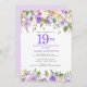 Honor a special woman with this elegant and feminine 19th Birthday party invitation. 19th is written in large purple text. Birthday celebration follows. The honored guest's name is also in purple capital letters. The birthday celebration details are surrounded top and bottom purple floral borders. The floral elements are nestled in deep green leaves. While it is a traditional design, the open and airy botanical foliage and text give it a contemporary vibe.