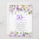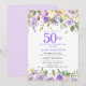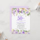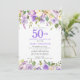 Honor a special woman with this elegant and feminine 50th Birthday party invitation. 50th is written in large purple text. Birthday celebration follows. The honored guest's name is also in purple capital letters. The birthday celebration details are surrounded top and bottom purple floral borders. The floral elements are nestled in deep green leaves. While it is a traditional design, the open and airy botanical foliage and text give it a contemporary vibe.