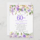 Honor a special woman with this elegant and feminine 60th Birthday party invitation. 60th is written in large purple text. Birthday celebration follows. The honored guest's name is also in purple capital letters. The birthday celebration details are surrounded top and bottom purple floral borders. The floral elements are nestled in deep green leaves. While it is a traditional design, the open and airy botanical foliage and text give it a contemporary vibe.