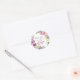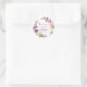 Pretty and girly purple, pink and green floral watercolor wreath "thank you" classic round sticker for a baby shower. This whimsical sticker has a white background and elegant dark grey and hot pink text. Personalise by adding your own name and baby shower date. You can even change the text colour and font style using the customise option.