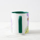 White mug, decorated with a watercolour design of Blue Geraniums and with a dark green rim and handle.