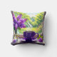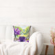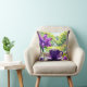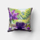 A pretty pillow with a gorgeous illustration of a vibrant purple lilacs sitting in a glass vase on a window sill next to a steaming cup of warm coffee on a bright summer day.