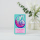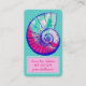 A colourful sea shell is on the front of this card. The pretty shell is a button type shell (umbonium), which has a pleasing spiral shape. The shell's details are a bright cobalt blue. Inside the shell there are swirls of light turquoise, magenta, and light frost pink. Your information, which might include your name, phone number, and email address, is framed within a two-tone pink template. There is also a template on the back for any additional information, or it is easily removed.