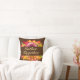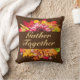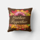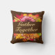 Pretty Fall / Thanksgiving themed throw pillow features an Autumn watercolor illustrated split wreath of leaves with centred "Gather Together" customisable text on dark brown background.