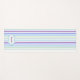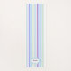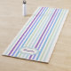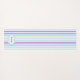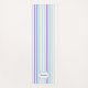 Personalised yoga mat done in a blue, purple, green and white striped pattern. Graphics of a decorative text area has custom text ready to personalise. Same design is featured on both the front and backside of the mat.