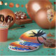 Birthday party plates. Vintage colours palm tree silhouette and ocean waves on a sandy beach ai generated artwork.