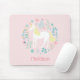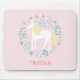 A pretty mouse pad featuring a cute unicorn and floral design on a blush pink background. Personalise it with a name.