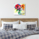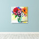 A floral wall art. A pretty canvas print with an illustration of a colourful vibrant glass vase of flowers done in an ai impasto style oil painting.