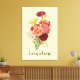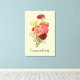 Vintage botanical illustration features bouquet of carnations in a variety of colours. Background has the look of ecru burlap. Modern script text title overlay