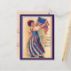 A pretty reproduction of a vintage Fourth of July card, it has been edited to clean the image up, and it has a reproduction of a vintage postcard on the back so that you can write a message. Send it in the mail or give it with a 4th of July gift to add a touch of whimsy. It features a design of a woman in a striped dress and holding a flag on a dark blue background.