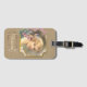 Pretty luggage tag features blonde vintage woman's portrait with added flowers and hummingbird, customisable text for name or year, all on a leather look background
