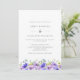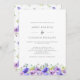A pretty wedding invitation featuring a bottom border of watercolor violet flowers and green leaves. The reverse features a pattern of violet flowers.