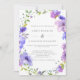 A pretty wedding invitation featuring a watercolor oval wreath of violet flowers and green leaves. The reverse features a pattern of violet flowers.