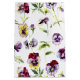 Pretty floral pattern features yellow and purple watercolor pansies and leaves on white background.