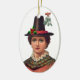 A lovely Welsh girl with enchanting eyes, a sprig of holly in her hat, standing beneath a mistletoe, is featured on this elegant ornament. On the reverse, the inscription reads, "Kiss a Welsh girl beneath a mistletoe; smile forever." This is just right for your Christmas tree or festive room decorations.