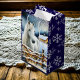 A pretty white horse standing behind an old rustic wood fence with a snowy background and vintage old red barn. Sides are dark blue with white snowflakes. The snow-filled fence is adorned with illuminated Christmas lights to give a warm festive feel to your country Christmas gift bag.