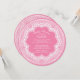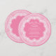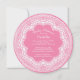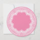 Pretty baby shower invitation for a girls baby shower featuring a dainty white lace frame set on a dark pink background round die cut circle. Flip our modern & fun Baby shower invitation over to view a matching back for an extra special touch.