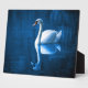 A lovely nature scene of a white swan swimming on a peaceful blue lake. The dark blue shadows contrasts nicely with the soft blue lighting on this peaceful swan.