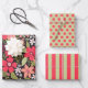 A pretty coral and green pattern of wildflowers with corresponding stripes and polka dots.