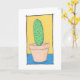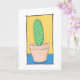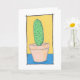 This greetings card has a naive art composition, of a single lobed prickly pear cactus in a flower pot. The background is yellow and blue, the pot is pinky beige and the cactus is very green and spiky, all contained within a thin black border, with a white surround. You can personalise the card with your own message inside, or leave blank. The artwork is original and only available from The Art of Being Beth at Zazzle.