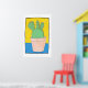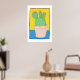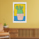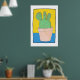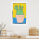 This poster has a simple composition, hand drawn using pens and watercolour, of a Prickly Pear cactus in a flower pot. The cactus is fat, with three lobes on top. The background is yellow and blue, the pot is pinky beige and the cactus is very green and spiky, all contained within a thin black border, with a white surround. It's a charming example of simple, naive, art.