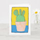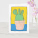 This greetings card has a naive art composition, of a prickly pear with three lobes on top. It is in a pinky beige flower pot. The background is yellow and blue. The cactus is very green with red spikes, inside a thin black border, with a white surround. You can personalise the card with your own message inside, or leave blank. The artwork is original and only available from The Art of Being Beth at Zazzle.