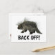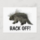 Send this card to get bill collectors or meddling in-laws off your back. Image features a porcupine and the warning "Back Off!" A porcupine is any of 29 species of rodent from a number of families. Porcupines are indigenous to the Americas, southern Asia, and Africa. Porcupines are the third largest of the rodents, behind the capybara and the beaver. Most porcupines are about 25–36 in (63–91 cm) long, with an 8–10 in (20–25 cm) long tail. Weighing between 12–35 lb (5.4–16 kg), they are rounded, large and slow. Porcupines come in various shades of brown, grey, and the unusual white. Porcupines' spiny protection resembles that of the unrelated hedgehogs and echidnas. The name porcupine comes from Middle French porc espin (spined pig) A regional American name for the animal is quill pig. The North American porcupine, Erethizon dorsatum, has the northernmost range of all the world's porcupines. Evidence indicates that they have only been a part of North American fauna sincemillion they immigrated north from South America some three million years ago. Porcupines are 25 to 31 inches long covered with hair and quills of varying length, except on the foot pads and nose. The tips of the long guard hairs are lighter and give the coat hues of yellow or white. The hair and a thick layer of body fat helps keep the porcupine warm during the winter. The tail is extremely muscular and adapted to aid in climbing and defence. The upper surface of the tail is heavily covered with quills, while the underside is covered in bristle-like hairs used to aid in climbing. The quilled pelage of the porcupine makes it unique among North American mammals. Quills cover the body, except on the legs and belly. The quills are modified hairs which have microscopic barbs on the tips and are filled with a spongy matrix. Quills from different parts of the body vary in length, flexibility, colour, shaft diameter, and barb length. The average weight of an adult male porcupine ranges from 15 to 18 pounds, but some individuals can weigh up to 30 pounds. Adult females weigh about 2-4 pounds less than males. Porcupine have excellent senses of smell, hearing, and taste, but relatively poor eyesight. Porcupines make a wide variety of sounds ranging from whimpers to screams, depending upon the circumstance. Breeding takes place in the fall months from late September to early November. Males seeking receptive females expand their home ranges up to five times the normal size. If more than one male shows interest in the same female, they will fight for the opportunity to mate with the female. Males use their incisor teeth and quills when fighting, and usually it is the largest and heaviest male which wins dominance. The breeding male then splashes the female with urine. If she is not ready to mate, she shakes off the urine and leaves. If she is ready, she stays and the male mounts in the traditional posture with the female in front and the male in the rear. She will curl her tail over her back, covering most of the quills. Males reach maturity at 24 months and females at 12 months. After a gestation period of about 210 days, only a single young is born. The gestation period is extremely long for a rodent, twice the time for a beaver. At birth the young weighs between 1 and 2 pounds and is about 10 inches long. Its eyes are open and its body covered with long grayish-black hairs and quills. Within a matter of hours the quills dry and serve as protection. The young porcupine is then capable of following its mother, although the young will not be able to climb large trees for several weeks. The young are able to eat some vegetation after a few weeks, but the female continues nursing the young for 3.5 months. During the summer the young stay close to their mothers, learning about den sites and food trees, but towards the end of summer they start to spend more time apart. By October, when the female mates again, the young are fully weaned and wander off to face the winter alone. Porcupines utilise natural cavities, such as rock caves, hollow logs and trees, or even the thicker vegetation in a tree as dens. In areas without snowfall, dens are not used so much. Porcupines stay active throughout the winter. Porcupines are primarily arboreal, and spend most of their time in the winter feeding in trees. While powerful climbers, porcupines do occasionally fall from trees. Thirty percent of the animals examined in one study showed evidence of healed fractures indicating that they had fallen out of trees. When climbing, the porcupine uses the stiff bristles on the undersurface of the tail as support. The animal has long, curved front claws which also aid in climbing. The inner bark (phloem and cambium layers) of spruce, birch and hemlock and spruce needles are the major winter foods for porcupine living in Alaska. In the spring and summer, buds and young green leaves of birch, aspen, cottonwood and willow are eaten until the tannin levels build too high for the porcupine to tolerate. Because they are vegetarians and most vegetable matter is very low in sodium, porcupines need additional sodium in the blood to balance cell potassium levels. As a result, porcupines seek out salt sources such as natural licks, glue which bonds plywood together, human perspiration on tools, road salt, and some paints. Porcupines also feed on shed antlers and the bones of dead animals to obtain sodium and calcium. Most carnivores would not pass up a meal of porcupine. However, an encounter between a young inexperienced predator and a porcupine can be a very painful experience. Some unfortunate carnivores have starved to death because a mouthful of quills has prevented them from eating. In an effort to remove the quills, the predator can cause the barbed quills to work into the deep tissues. Predators have different means of killing and eating porcupines. In the Northeast United States, the fisher has learned to specialise on a diet of porcupine. The fisher ci