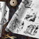 Illustrations from 1894 edition of Pride and Prejudice by Jane Austen with memorable quotes in monochrome black and white toile style, for the lovers of the book, Mr. Darcy and Regency era romance. The pattern is seamless.