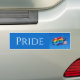 A bright blue bumper sticker featuring a billowing rainbow Pride flag along with an American flag. Celebrating a welcoming, diverse America. Photographed at Cherry Grove on Fire Island. Part of the Pride Collection.