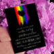 Charming lgbt wedding invitation with rainbow pride flag drawn with messy strokes and adorned with a black heart against a black background.