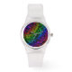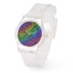 I only have one complaint. I ordered the watch with clear case and strap, and what was sent was white case and strap. I'm going to keep it because 1) it looks very nice in white, and 2) it would take too long to get a replacement made and sent in time for my occasion. Aside from the mix up with the color, the watch does look very good in white. The purple dial is actually sparkly which did not show in the online images. That was a nice surprise. If you like Swatch watches this is very similar to those. It's 33.6mm in diameter, 10.5mm thick, and 40.6mm lug to lug. Stainless steel case back says 3ATM/30m WR, so no swimming or showering or submerging this one. If you like Woodstock, this is a great choice.