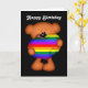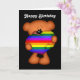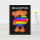 Cute greetings card / note card of two little teddy bears holding giant gay pride rainbow hearts.. with the words "Happy Birthday" cute teddy greetings card from Ricaso