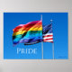 A bright poster featuring a billowing rainbow Pride flag along with an American flag, set against a perfect blue sky. Celebrating a welcoming, diverse America. Photographed at Cherry Grove on Fire Island. Part of the Pride Collection.