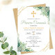 Celebra la Primera Comunión de tu hijo con esta elegante invitación, que presenta hermosas hojas verdes en acuarela y una delicada cruz. Esta invitación religiosa captura perfectamente la esencia de una Comunión Católica, combinando ternura y sofisticación para crear un recuerdo memorable para este día tan especial.