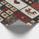 This wrapping paper features a folk art patchwork aesthetic, arranged in a grid of square blocks that blend both appliqué and pieced elements. Appliquéd motifs include a bold orange pumpkin, a black crow, red hearts, chickens, and stylised florals, while the pieced blocks showcase traditional geometric quilt patterns such as stars, diamonds, and crosses. The use of deep reds, creams, and dark blues/blacks, accented with patterned fabrics like polka dots, florals, and textured solids, creates a warm and rustic style. Perfect for farmhouse décor, country living, primitive crafts, and seasonal quilts, this design embodies the charm of traditional quilting with a cosy, handmade feel.