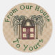 Primitive country round sticker features a burgundy primitive saltbox house with willow trees on each side. Green Text reads "From Our House to Yours" in green on a beige background. Perfect for any occasion.