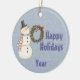 Fun country/primitive style ornament with a swirly blue and white background. A whimsical snowman is holding a wreath and it says Happy Holidays and the year!
